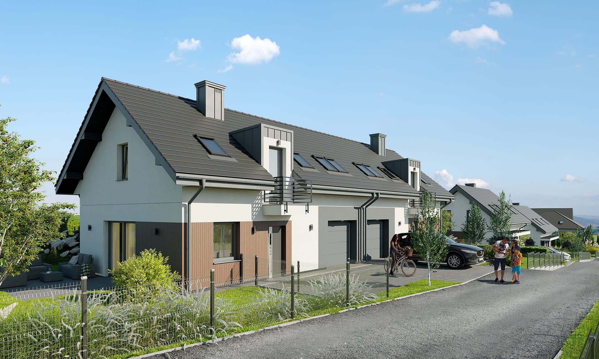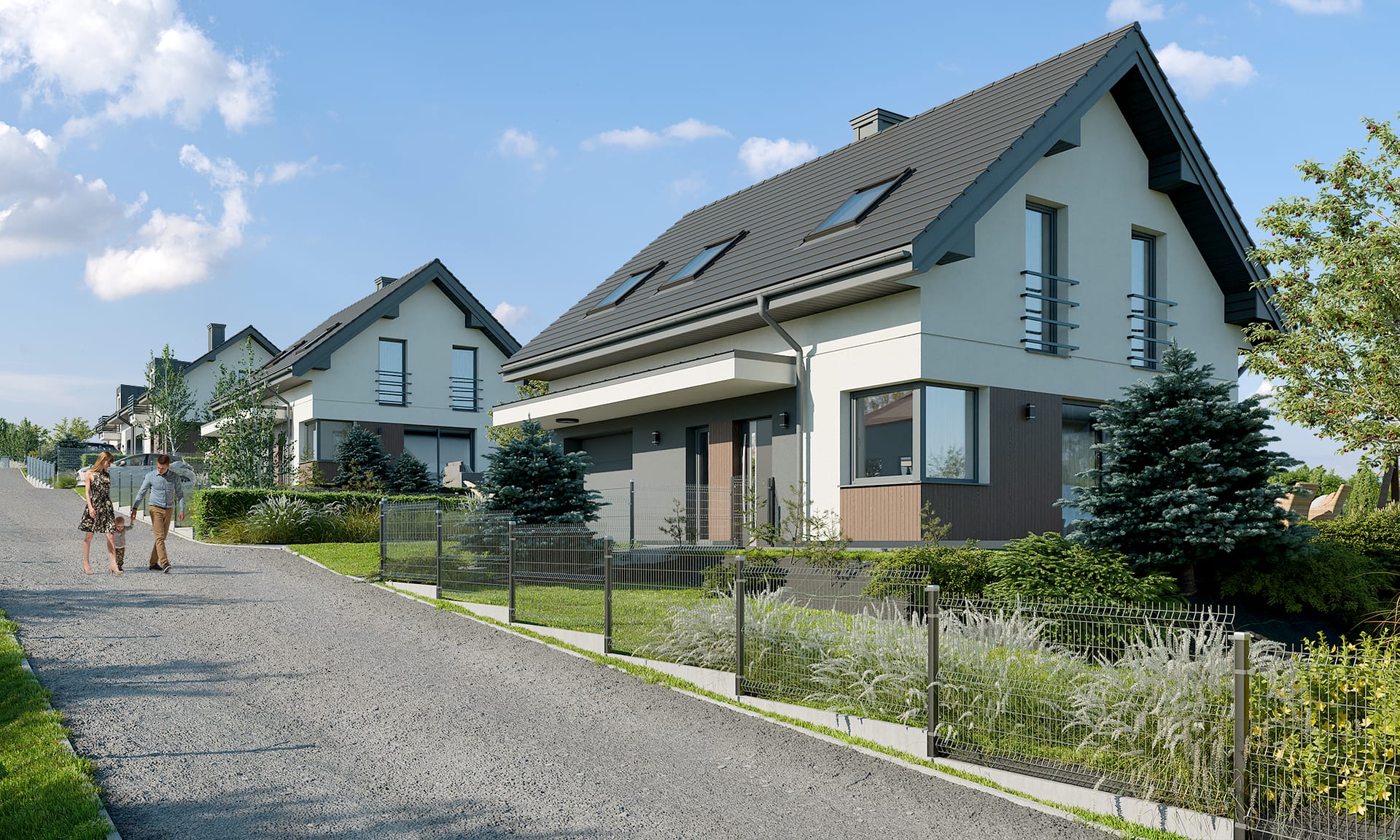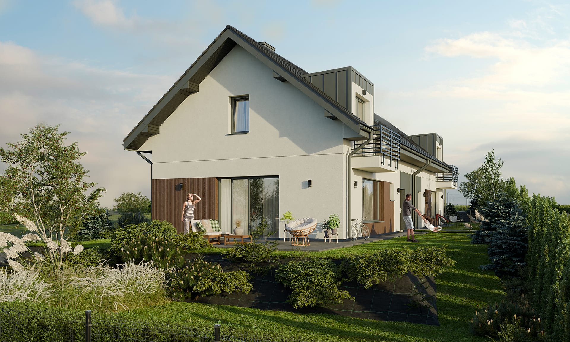 Każdy dom ma duży prywatny ogród, który w połączeniu ze spokojnym charakterem okolicy, jest idealnym miejscem do wypoczynku na świeżym powietrzu. Powierzchnia działek wynosi od 460 do 600 m², oferując Ci nie tylko mnóstwo przestrzeni dla zielonych aranżacji, ale również dla rodzinnych spotkań czy letnich grillów. Do budynków przynależą tarasy zewnętrzne, wyłożone betonowymi płytkami. Domy w bliźniaku mają dodatkowo balkony na piętrze.